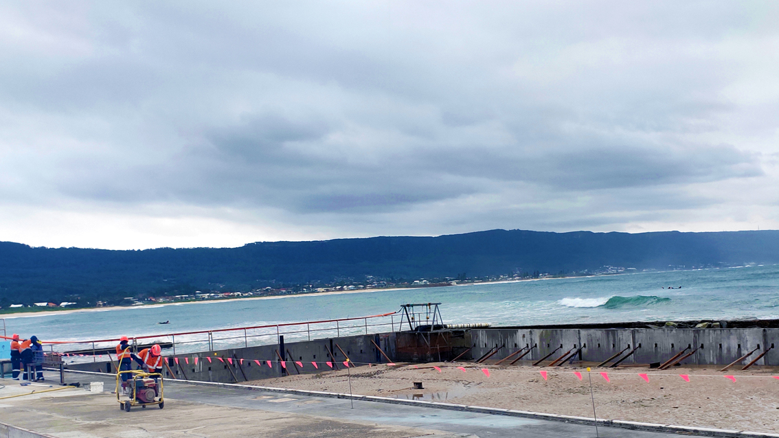 Ocean pools are an important feature of the Australian coastline particularly in New South Wales. Ocean pools are located on a rocky surf coast, so that waves and tide can wash into the pool. This reconstruction job site is located in Bellambi, Wollongong in the Illawarra region of New South Wales, Australia.